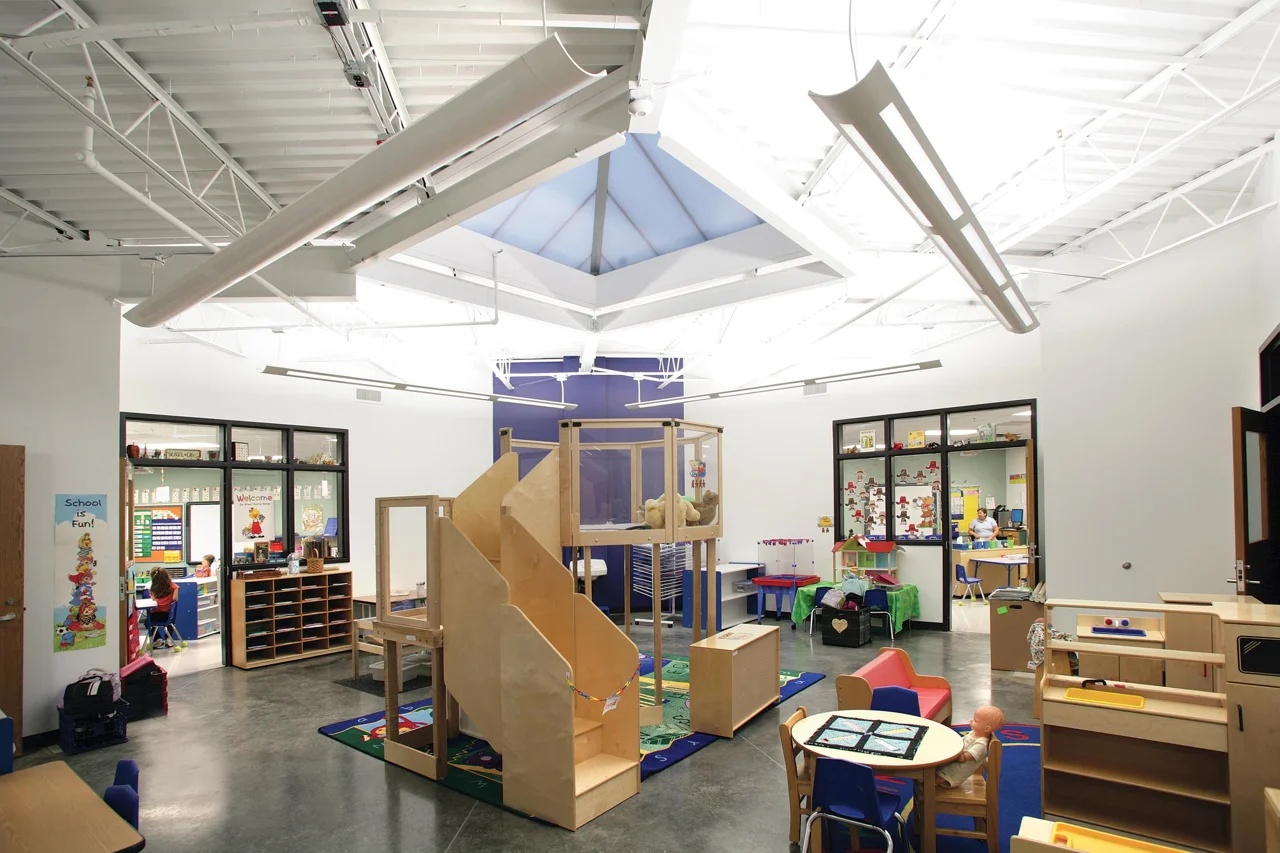 We were hired to create a new Early Childhood Center, comprised of four pre-K and four kindergarten classrooms with shared learning areas. We moved the front door to the opposite side to provide more space for drop-offs and enlarged the cafeteria and designed new offices. We also updated the pre-K and kindergarten classrooms to create shared activity and learning areas. To create a warm, whimsical learning atmosphere, we included bright colors and inspiring words down the main hallway.